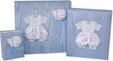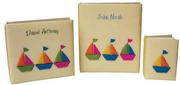This gorgeous design by Marcela Creations can be personalized with blue thread to match the sailboats. Can be personalized with name only, date only or name plus date. The album comes in a Post-Bound Photo Album, a Baby Memory Book or as a Post-Bound Scrapbook. Post-Bound Photo Album: This large photo album includes 8 PVC-free and acid-free magnetic pages. Each page is large enough to hold an 8" X 10" print. Refill pages and additional post are available. Album is 13-1/2" X 13-1/2". Baby Memory Book: Ring-bound baby memory book with a white, three-ring binder. Includes adorably illustrated pages to record important events, as well as three protected archival sheets. 10" wide by 11-3/4" high. Post-Bound Scrapbook: This large book includes 30 blank, acid-free scrapbook pages. Refill pages and additional post are available. Album is 13-1/2" wide X 13-1/4" high. All albums are individually packaged in a gift box. Allow 4-5 weeks for delivery.